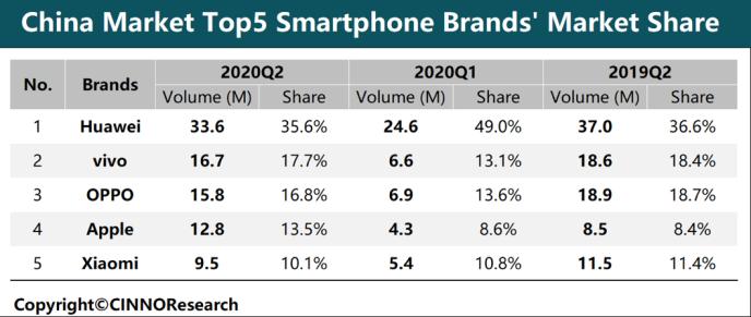 CINNO數(shù)據(jù)顯示,今年上半年,受疫情影響,中國(guó)智能手機(jī)市場(chǎng)銷量約1.4億部,同比下降24.7%。不過,第二季度,中國(guó)智能手機(jī)市場(chǎng)銷量約9400萬(wàn)部,環(huán)比大幅增長(zhǎng)86%,同比則下降7%。上半年銷量前三名分別為華為(含榮耀)、vivo(含IQOO)、OPPO(含realme),三家銷售總量占國(guó)內(nèi)智能手機(jī)市場(chǎng)的71.9%。