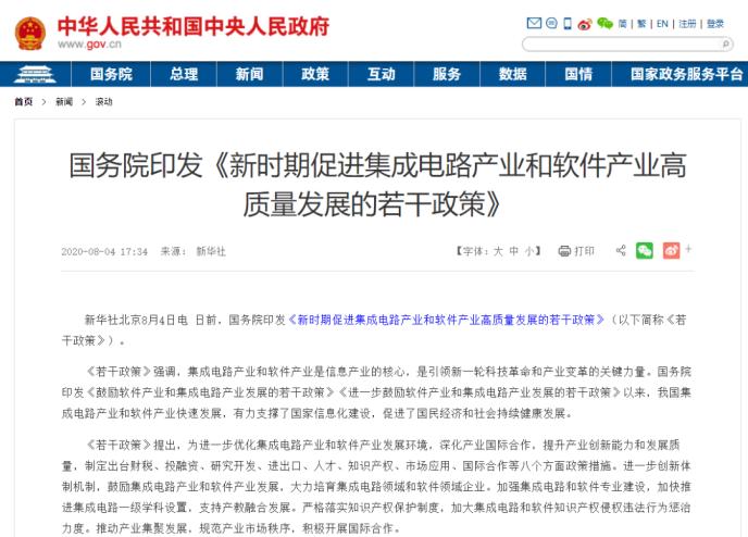 8月4日晚間,國務(wù)院發(fā)布《國務(wù)院關(guān)于印發(fā)新時期促進(jìn)集成電路產(chǎn)業(yè)和軟件產(chǎn)業(yè)高質(zhì)量發(fā)展若干政策的通知》,為進(jìn)一步優(yōu)化集成電路產(chǎn)業(yè)和軟件產(chǎn)業(yè)發(fā)展環(huán)境,深化產(chǎn)業(yè)國際合作,提升產(chǎn)業(yè)創(chuàng)新能力和發(fā)展質(zhì)量,制定出臺財稅、投融資、研究開發(fā)、進(jìn)出口、人才、知識產(chǎn)權(quán)、市場應(yīng)用、國際合作等八個方面政策措施: