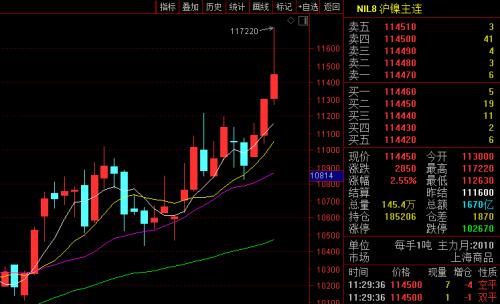 8月6日,滬鎳主力合約2010再度漲幅居前,盤中一度報117220元/噸,刷新2019年11月以來的高點。截至上午收盤,該主力合約報2.55% ,漲幅2.55%。