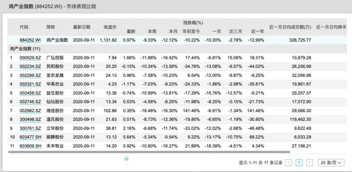 Wind數(shù)據(jù)顯示,雞產(chǎn)業(yè)指數(shù)上周(9月7日-9月11日)累計(jì)下跌9.33%,本月累計(jì)下跌12.12%,年初至今跌逾10%。