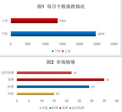 市場情緒說明:每日個股漲跌情況如圖1所示,圖2為漲停個股(新股除外)數量以及漲停未遂炸板股數量,反應市場強弱(弱<30≤較弱<40≤中等<50≤強<80≤很強)。