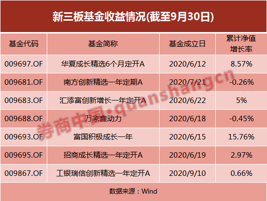 從新三板基金的收益看,自6月12日首只可投新三板基金成立以來,截至目前共發行成立7只可投新三板的公募基金。截至9月30日,這些基金的業績出現分化,平均收益率4.6%,最高一只收益超過15%,同時有兩只基金收益非正,凈值出現了小幅下跌。