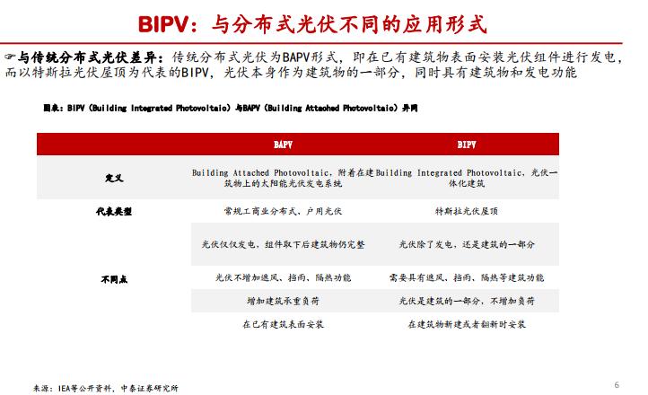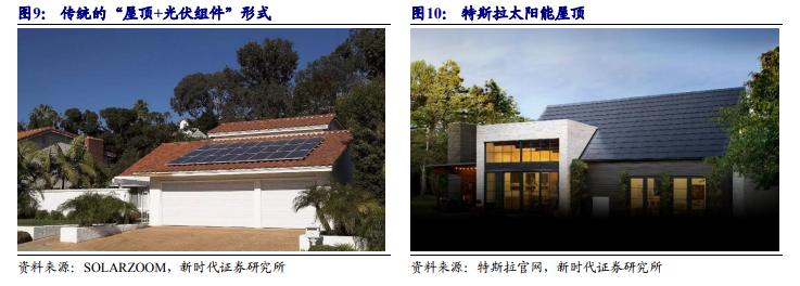 與傳統分布式光伏為BAPV形式(在已有建筑物表面安裝光伏組件進行發電)不同,以特斯拉光伏屋頂為代表的BIPV,光伏本身作為建筑物的一部分,同時具有建筑物和發電功能。