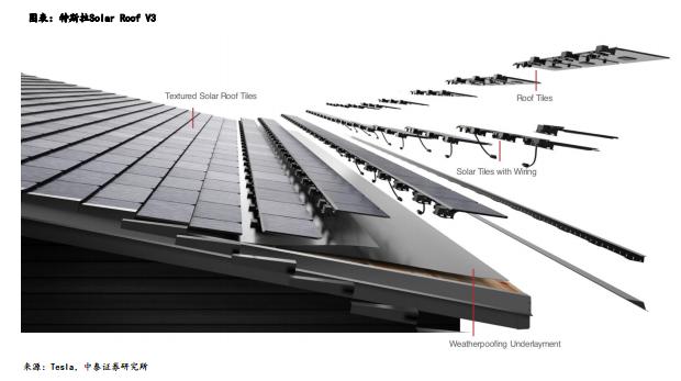 經歷幾年的發展,在2019年10月, 特斯拉推出第三代光伏屋頂即Solar Roof V3,外觀類似于普通的瓦片,但表面為帶紋理的玻璃,內部隱藏有可以發電的光伏電池,實現光伏建筑一體化(BIPV),拓展應用空間,引起市場關注。