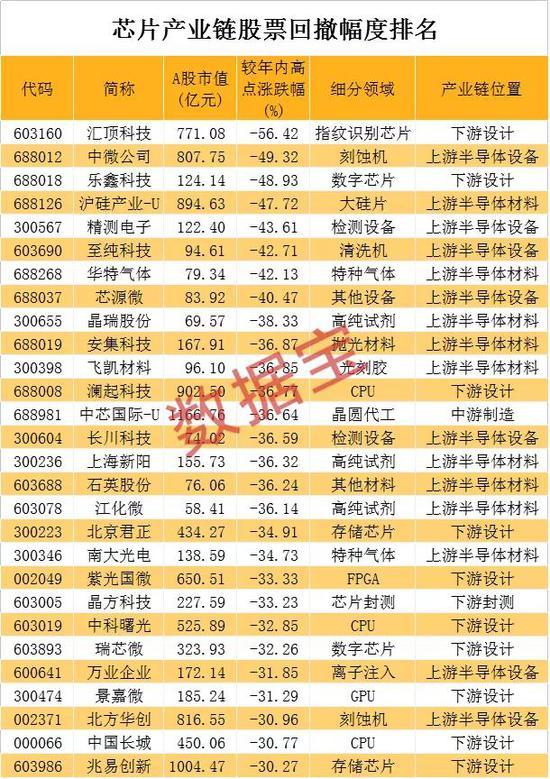 雖有個別芯片概念股出現異動情形,但近期受國內外多重因素影響,芯片板塊整體的熱度已大不如前。數據顯示,芯片產業鏈股票中,僅3股較年內低點回撤幅度低于10%,分別是三安光電(行情600703,診股)、晶豐明源(行情688368,診股)、立昂微。近50%產業鏈股票回撤幅度超過30%,包括匯頂科技(行情603160,診股)、中微公司(行情688012,診股)、樂鑫科技(行情688018,診股)、滬硅產業(行情688126,診股)、精測電子(行情300567,診股)等。
