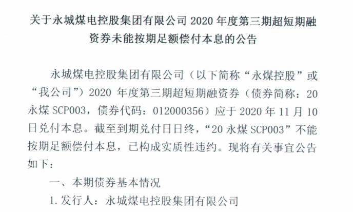 在2020年收官階段,AAA級地方國企永煤控股意外炸雷引爆債券市場。11月10日,永城煤電控股集團有限公司(永煤控股)公告稱,因流動資金緊張,“20永煤SCP003”未能按期足額償付本息,構(gòu)成實質(zhì)性違約。