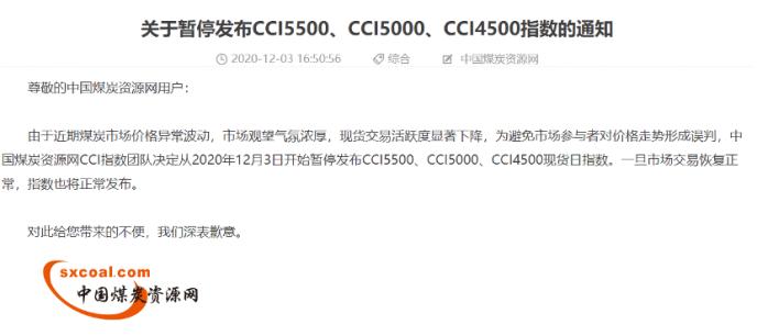 據(jù)中國煤炭資源網(wǎng),由于近期煤炭市場價格異常波動,為避免市場參與者對價格走勢形成誤判,從12月3日起開始暫停發(fā)布CCI5500、CCI5000、CCI4500現(xiàn)貨日指數(shù)。
