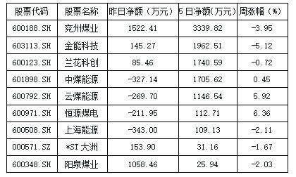 本周煤炭開采加工概念板塊大單凈流入前十: