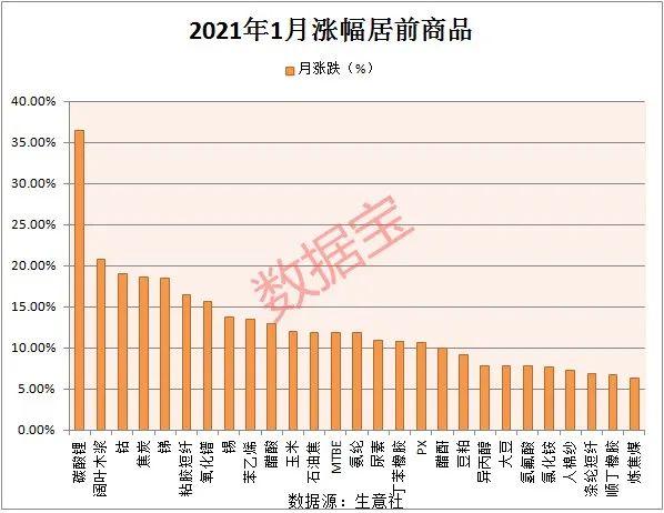 據生意社價格監測,2021年1月滬深原材料價格漲跌榜中,環比上升的商品共70種,其中29類商品集中在化工板塊,9類商品集中在紡織板塊,而漲幅超5%的商品主要集中在化工板塊,漲幅前三的商品分別為碳酸鋰、闊葉木漿和鈷。