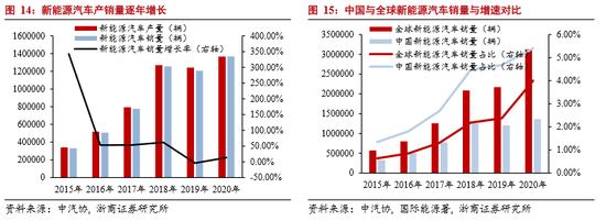 未來新能源汽車有望呈現出跨越式增長。2020年10月,由工業和信息化部、中國汽車工程學會編制的《節能與新能源汽車技術路線圖2.0》(下稱“路線圖2.0”)正式發布。首先,路線圖指出,新能源汽車的車型做包括純電動汽車(BEV)、插電式混合動力汽車(PHEV)和氫氣燃料電磁汽車;其次,對不同的車型,路線圖也做出了預測,對于BEV和PHEV,2025年、2030年與2035年兩類車型年銷量占汽車總銷量有望分別達到15%-25%、30%-40%、50-60%,對于氫氣燃料電磁車,2025年運行車輛或達到10萬輛,2035-2035年間保有量有望達到100萬量左右,均將實現跨越式增長。此外,中汽協發布的《新能源汽車產業發展規劃》也對新能源汽車銷量做出了預測,規劃指出“至2025年,我國新能源汽車占新車總銷量占比20%”的目標推算,2025年,我國新能源汽車銷量便有望達到600萬輛。